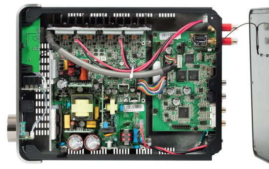 Większą część obudowy zajmują końcówki mocy wraz z rozbudowanym zasilaczem, mniejsza płytka przedwzmacniacza jest pełna układów cyfrowych.