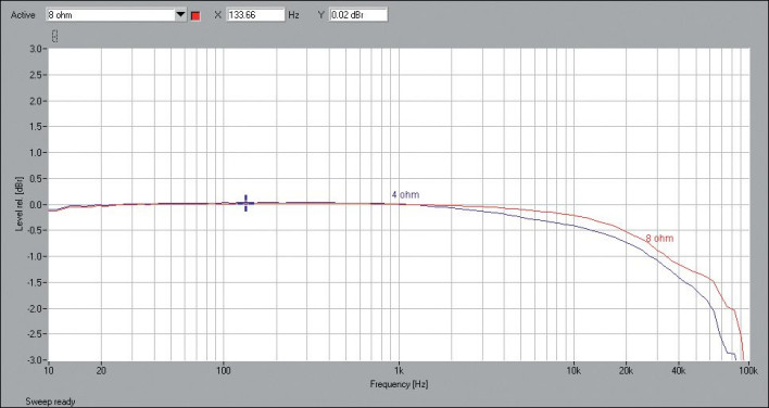 Trzymając się normy i 1% THD+N, przy 8-omowym obciążeniu (i na 8-omowych zaciskach) uzyskujemy 66 W, a przy 4 Ω tylko nieznacznie mniej, bo 64 W, i to zarówno przy wysterowaniu jednego kanału, jak i obydwu jednocześnie. Utrzymywanie podobnej mocy dla obydwu obciążeń jest typowe dla takich konstrukcji (z oddzielnymi odczepami transformatorów głośnikowych, optymalizowanymi dla różnych impedancji, a więc wykorzystującymi maksymalny potencjał samych lamp). Z kolei na granicy 1,5% zniekształceń moc sięga XX W.