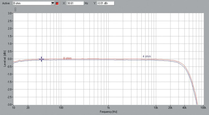 C388 świetnie poradził sobie także w trudnym (dla wzmacniaczy w klasie D) teście charakterystyki przenoszenia (rys.1), która niemal nie zdradza, że mamy do czynienia z taką konstrukcją. Charakterystyki dla obydwu obciążeń są idealnie zbieżne, opadają łagodnie już powyżej 20 kHz, ale punkty -3 dB wyznaczamy dopiero powyżej 70 kHz.