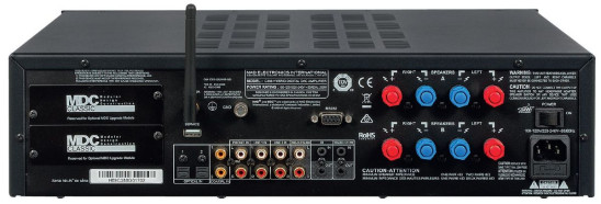 Podłączenie zewnętrznej końcówki mocy lub subwoofera umożliwia stereofoniczne wyjście z przedwzmacniacza, są też wyjścia cyfrowe, a zdalne sterowanie i instalację usprawni zestaw RS232/wyzwalacze/wejście i wyjście sygnałów podczerwieni. Port USB (typ-A) spełnia funkcje serwisowe.