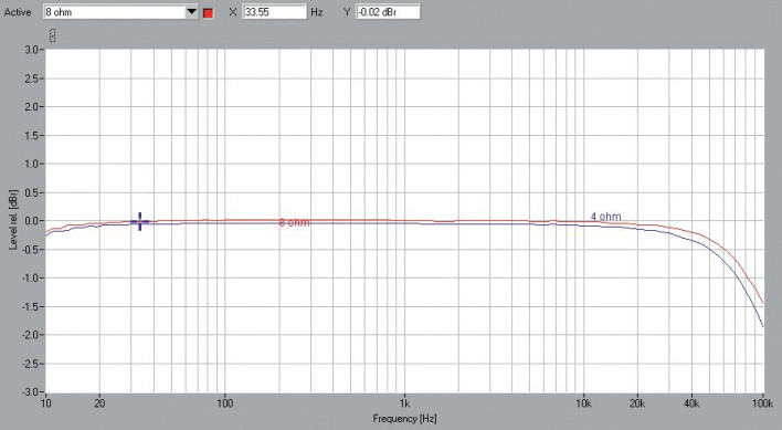 Liniowość charakterystyki przenoszenia (rys.1) jest świetna, przy 100 kHz spadek wynosi zaledwie ok. -1,5 dB (8 Ω) i ok. -2 dB (4 Ω). Odstęp od szumu też jest dobry (87 dB), a dzięki wysokiej mocy, dynamika sięga 107 dB.