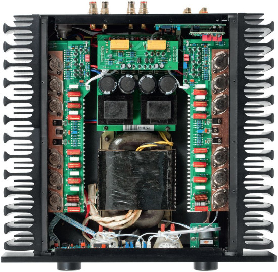 Wielkie radiatory zajmują sporą część miejsca, zasilacz też niczego sobie - bazuje na potężnym transformatorze z rdzeniem R-Core.