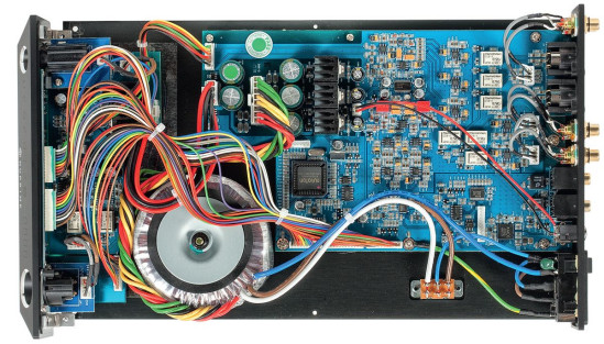 Wnętrze NuPrima DAC-10H wypełnia jeden duży moduł z elektroniką audio oraz dedykowanymi układami zasilającymi, oraz kilka mniejszych płytek, które pełnią rolę wzmacniacza słuchawkowego i obwodów wyświetlacza.