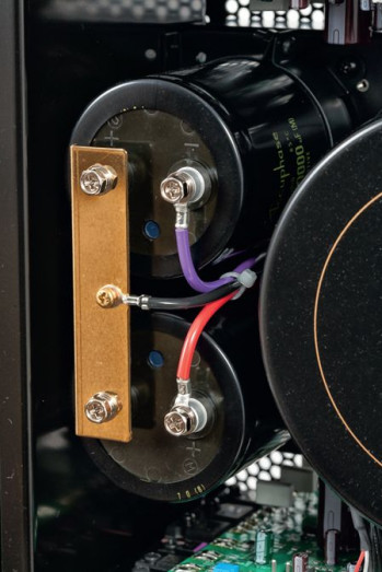 W centralnej sekcji widać dużą pokrywę, pod którą znajduje się transformator toroidalny. Zasilanie nie jest więc stuprocentowym dual mono (wymagającym dwóch transformatorów), ale przygotowano niezależne uzwojenia wtórne dla każdego kanału, pojemność filtrująca wynosi 2 x 50 000 ηF (a więc trochę ją powiększono w stosunku do modelu E-600, gdzie wynosiła 2 x 47 000 F), kondensatory połączono dużą, metalową zworą.