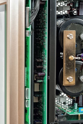 Z kolei zaciski głośnikowe są podłączone bezpośrednio do płyty, bez dodatkowych przewodów; w ten sposób usunięto kolejne miliomy z sumarycznej impedancji wyjściowej wzmacniacza. Wzmacniacz słuchawkowy to niezależny moduł złożony z elementów dyskretnych.