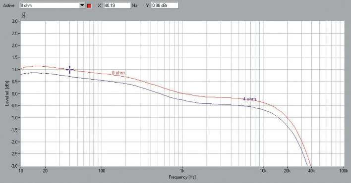 Badanie pasma przenoszenia (rys.1) przyniosło wyniki wyjątkowe. Przy 10 Hz widać lekkie podbicie (+1 dB), z kolei powyżej 10 kHz charakterystyka już szybko opada (-3 dB przy ok. 40 kHz). Wygląda to trochę tak, jakby w ścieżkę sygnału był włączony jakiś układ korekcyjny (nawet teoretycznie "wyzerowany").