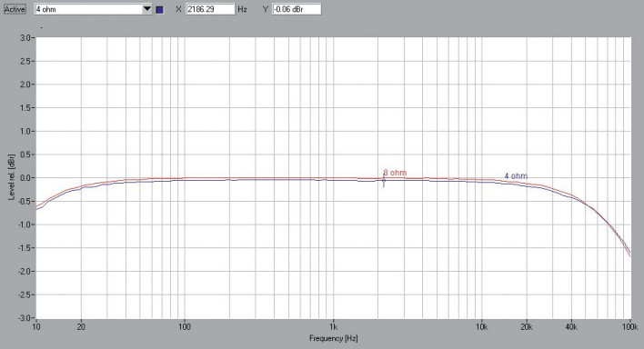 Co prawda wzrost mocy (w stosunku do 8 Ω) nie jest dwukrotny, a moc w każdym kanale jest już wyraźnie niższa niż przy pracy pojedynczego, ale to wciąż świetny rezultat, którego producent wcale nie obiecywał, tym bardziej, że nie ma tu obwodów impulsowych, lecz konwencjonalna amplifikacja w klasie AB. Czułość jest bliska standardowej, umiarkowanie wyższa - 0,3 V.
