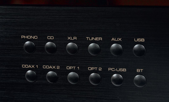 Selektor wejść ma nietypową formę 12 przycisków, co wygląda utylitarnie, ale pozwala szybko dotrzeć do pożądanego źródła.