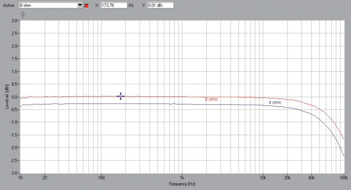 Za wysoki poziom szumów również odpowiadają lampy w stopniu wejściowym, więc przy S/N wynoszącym 78 dB, dynamice nie udaje się dotrzeć do 100 dB. W pomiarze charakterystyki przenoszenia (rys.1) HTA- -2000B V.2 prezentuje się już bardzo dobrze, przy 10 Hz nie mamy żadnego spadku, a przy 100 kHz – tylko ok. 1,5 dB. Poziom przy 4 Ω jest w całym pasmie nieco niższy (ok. -0,3 dB), ale charakterystyka jest podobna.