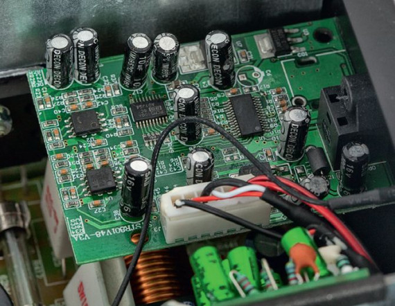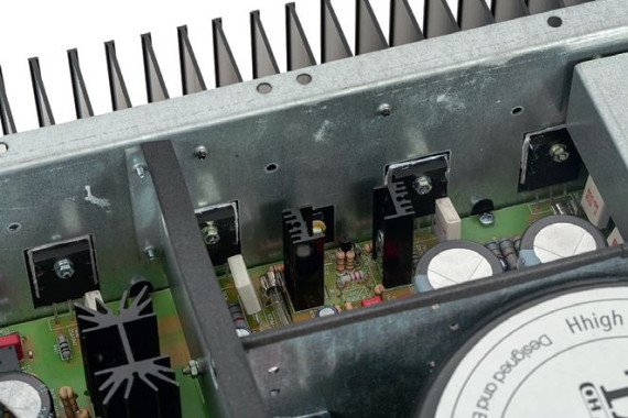 Końcówki mocy znajdują się po obydwu stronach, tamże ulokowano radiatory, a w każdym kanale pracują dwie pary (Toshiba 2SA1943 / 2SC5200) tranzystorów bipolarnych.