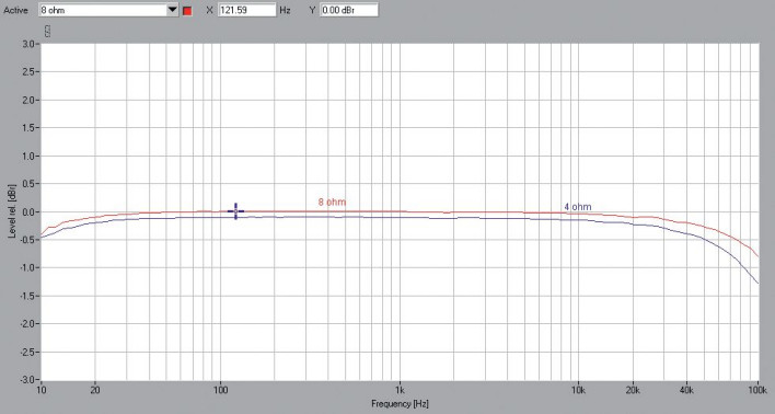 Z rys. 3. odczytamy zakresy mocy wyjściowej ze zniekształceniami THD+N poniżej 0,1 % - powyżej 1 W dla 8 Ω oraz 3 W dla 4 Ω. Warto jeszcze zauważyć, że obciążenie 8-omowe gwarantuje generalnie niższy poziom zniekształceń w całym badanym przedziale mocy.