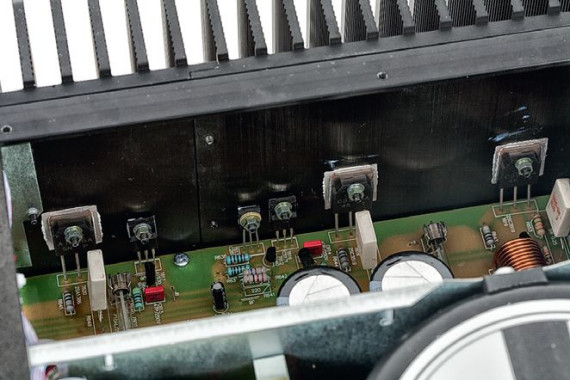 Końcówki mocy znajdują się z dwóch stron obudowy, oczywiście przy radiatorach. W każdym kanale zainstalowano dwie pary tranzystorów Sanken (2SA1386/2SC3519).
