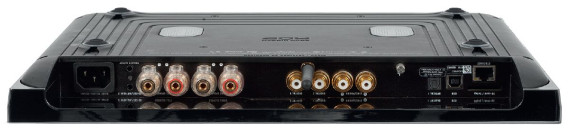 Gniazda i przewody ukryto pod wsuwaną maskownicą. Nie musi ich być wiele, wystarczy zasilanie oraz dwie pary kabli głośnikowych, a całą resztę można wyeliminować, bo w sekcji "połączenia" rządzi Wi-fi (dwuzakresowy obwód, pracuje w pasmach 2,4 GHz oraz 5 GHz). Dalej jest sieciowy LAN, a dopiero później USB-B.