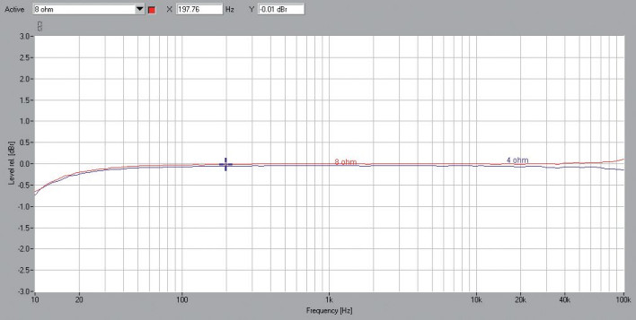 Charakterystyki przetwarzania (rys.1) są już wyśmienite, przy 10 Hz notujemy minimalny spadek (-0,5 dB), a przy 100 kHz mamy idealną wręcz liniowość (odchyłki nie przekraczają 0,1 dB). Na rys. 2. najsilniejszą harmoniczną jest trzecia, jednak jej poziom to umiarkowane -87 dB. Wykres THD+N (rys. 3) prezentuje się bardzo dobrze, poniżej 0,1 % schodzimy już od mocy 1,2 W przy 8 Ω i 2,4 W przy 4 Ω.