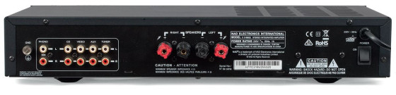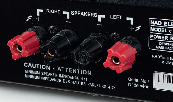 NAD C316BEE V2 jest jednak funkcjonalnie bardziej oszczędny niż np. Denon PM-800NE i Rotel A10, co pokazuje tylna ścianka. Zaciski głośnikowe są pojedyncze, mają plastikowe nakrętki, wyżłobione jednak w taki sposób, by można było łatwo (i mocno) zacisnąć kable.