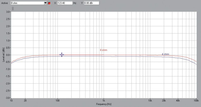 Spadki na skrajach mierzonego pasma przenoszenia (rys.1) są minimalne – ok. 0,5 dB, dla obydwu impedancji. Spektrum THD+N (rys. 2) potwierdza, że poziom szumów jest umiarkowany, nieznaczny jest też udział harmonicznych. Najsilniejsza jest druga (-85 dB), o 2 dB niżej leży trzecia. Bardzo dobrze prezentują się także charakterystyki THD+N z rys. 3. Wystarczy "grać" z mocą powyżej 1 W dla 8 Ω i 2 W dla 4 Ω, by zejść poniżej poziomu 0,1 %.