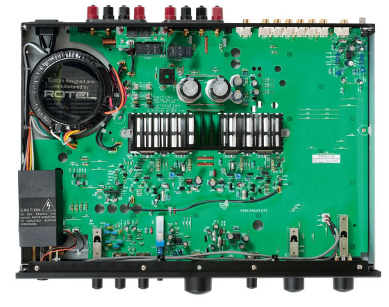Rotel zmontował niemal wszystkie obwody Rotela A10 na jednej dużej płytce drukowanej. Wycięto tylko jej niewielkie fragmenty na radiator i zasilacz. Pomimo skromnej wysokości obudowy, zasilacz jest liniowy, a jego podstawą jest porządny transformator toroidalny.