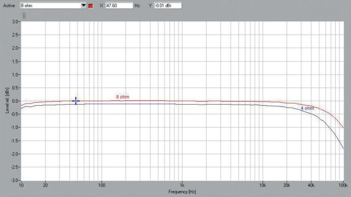 Wzmacniacz pokazuje też szerokie charakterystyki częstotliwościowe (rys.1), przy 10 Hz spadek jest śladowy, a dla 100 kHz -1 dB (8 Ω) i -1,7 dB (4 Ω). Trzecia harmoniczna jest najsilniejsza w spektrum z rys. 2., ale i jej poziom to niskie -89 dB. Niski poziom szumów oraz zniekształceń harmonicznych zaprocentował także korzystnym przebiegiem charakterystyk na tys. 3. W przypadku obciążeń 8- jak i 4-omowych wystarczy moc poniżej 1 W, aby uzyskać THD+N niższe od 0,1 %.