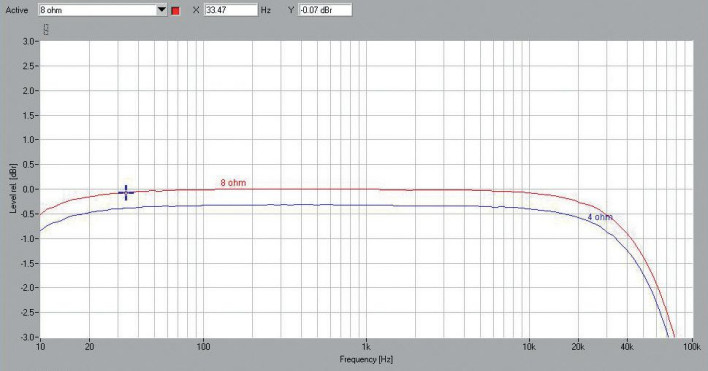 Z danych firmowych można dowiedzieć się o mocy 2 x 60 W przy obciążeniu 8 Ω, nie ma informacji o możliwościach przy 4 Ω, ale na szczęście nie ma też zakazu podłączania takiej impedancji, więc zbadaliśmy obydwie opcje. M2si okazuje się zdolny do większego wysiłku, przy jednym kanale wysterowanym oddaje 92 W przy 8 Ω i 121 W przy 4 Ω. W trybie stereo M2si uzyskuje 2 x 80 W przy 8 Ω i 2 x 103 W przy 4 Ω, i są to najlepsze wyniki w tej grupie.