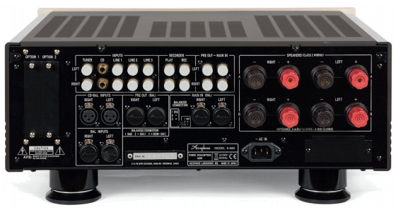 Lewą stronę (patrząc na wzmacniacz z tyłu) zagospodarowano dwoma zatokami dla opcjonalnych modułów (przedwzmacniacz gramofonowy i przetwornik C/A), wystarczy odkręcić zaślepkę i w odpowiednie miejsce wsunąć kartę, a wzmacniacz sam ją rozpozna i automatycznie aktywuje wszystkie funkcje.