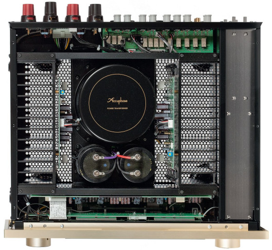 W stosunku do końcówek mocy Accuphase używa określenia "mono block", bo każda z nich ma własny radiator oraz płytkę drukowaną. W stopniach wyjściowych pracują trzy pary tranzystorów MOS-FET Vishay IRFP240/ IRFP9240.