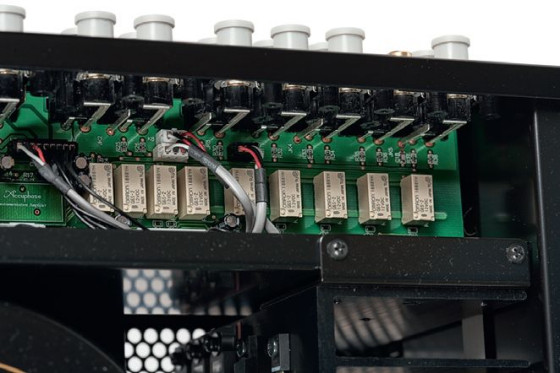 Sygnał z poszczególnych gniazd jest przełączany przekaźnikami, do ochrony końcówek mocy i rozłączania wyjść głośnikowych służą jednak przełączniki typu MOS-FET.