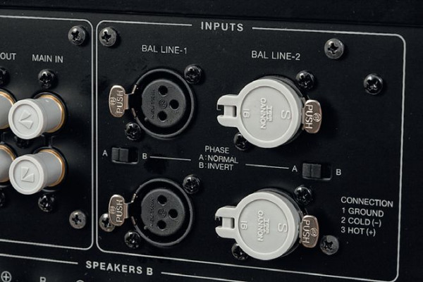 L-509X ma dwa wejścia XLR, każde z hebelkiem pozwalającym odwrócić fazę.