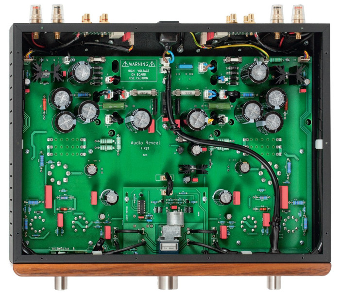 Sam wzmacniacz Audio Reveal First jest elegancki i skromny zarazem. Wysmakowany. Nie wymyślono tu wprawdzie niczego nadzwyczajnego, jest standardowy "blat" z lampami, a w tylnej części - wieże osłon transformatorów. Przednia ścianka jest wykonana z litego, egzotycznego drewna.