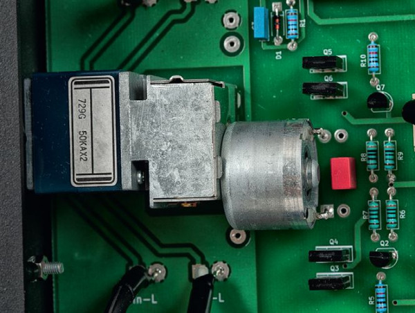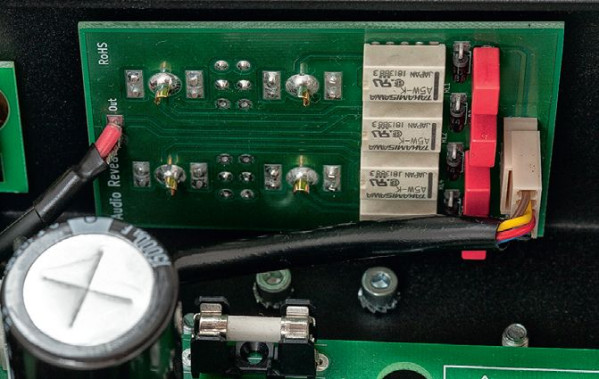 Po odkręceniu spodu widzimy dużą płytkę z czystym montażem, jest też kilka mniejszych modułów, np. wejściowe z przekaźnikami. Sygnał z wejść i selektora na tylnej ściance jest przesyłany do regulatora wzmocnienia w okolicach frontu porządnym kablem, do regulacji głośności wykorzystano klasyczny potencjometr firmy Alps, a skoro układ jest niesymetryczny, to takie rozwiązanie doskonale pasuje.