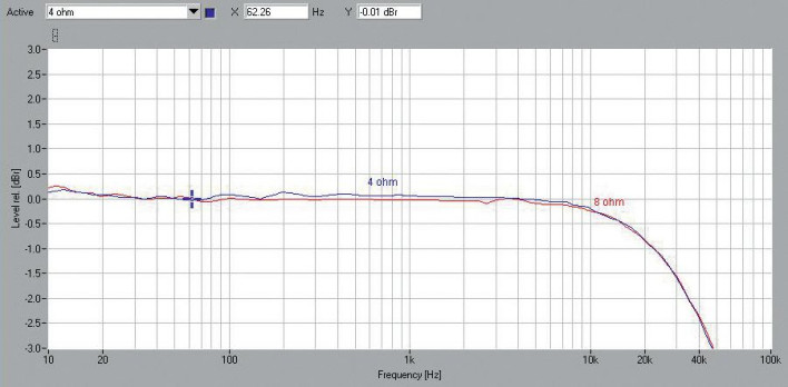 Na rys. 1b obydwie charakterystyki dotyczą obciążenia 8-omowego, kolorem czerwonym oznaczono tryb triodowy (krzywa znana już z rys. 1a), kolorem niebieskim – UL. Podbicie w zakresie niskotonowym jest wyższe dla tego drugiego, przy 10 Hz notujemy +0,7 dB, ale to wciąż bezproblemowa skala zjawiska.