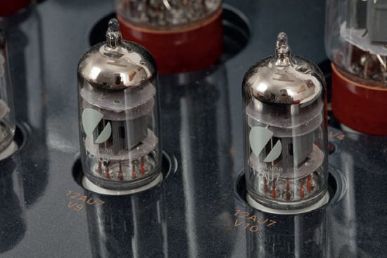 W pierwszym szeregu (gdy patrzymy na wzmacniacz z przodu) widać sześć lamp niskiej mocy 12AU7, które wykorzystano w stopniu wejściowym i sterującym. Podobnie jak w przypadku EL34, na lampach 12AU7 widnieją jedynie oznaczenia marki PrimaLuna.