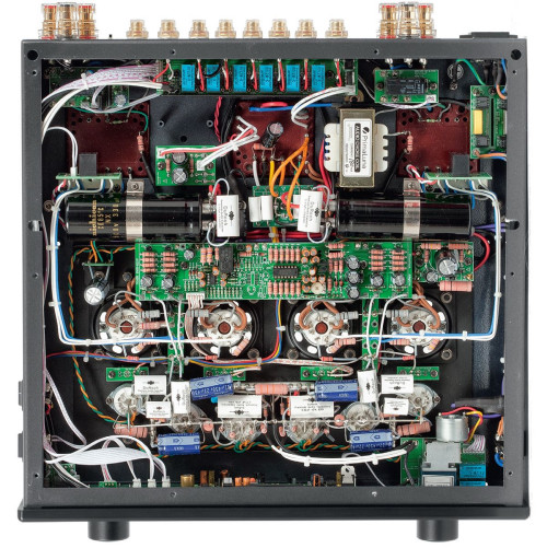 Dominują połączenia typu punkt-punkt, z niewielkim udziałem (w ramach sygnałów audio) płytek drukowanych. Widoczna w centrum obudowy okazała płytka to "tylko" rozbudowany system automatycznej regulacji prądu spoczynkowego lamp Adaptive Auto- Bias.