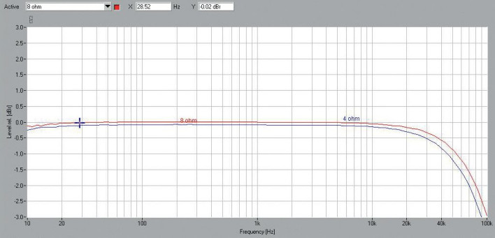 Przy 8 Ω moc wynosi 95 W, zarówno przy wysterowaniu jednego, jak i dwóch kanałów. Przy 4 Ω otrzymujemy 148 W lub 2 x 134 W.