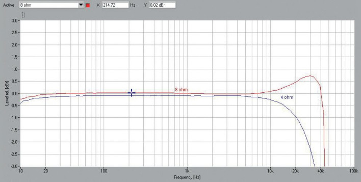 Specyfikę konstrukcji impulsowej widać również na rys.1., ale są to zjawiska o nieszkodliwej skali. Przy obciążeniu 8 Ω pojawia się lekkie wzmocnienie w zakresie wysokotonowym (+0,7 dB przy 30 kHz), a przy 4 Ω – wcześniejszy spadek; -3 dB wyznaczamy przy 44 kHz dla 8 Ω i 33 kHz dla 4 Ω.