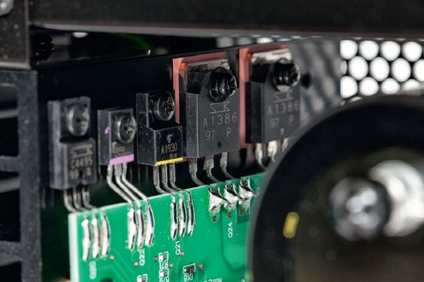 W każdym kanale pracują dwie pary tranzystorów wyjściowych. To elementy Sankena, wcześniej Accuphase stosował pary 2SA-2637/2SA1186, a teraz bardziej wydajne 2SA- 1386/2SC3519, co pozwoliło (przy wsparciu zasilacza) na uzyskanie wyższej mocy znamionowej niż w E-370.