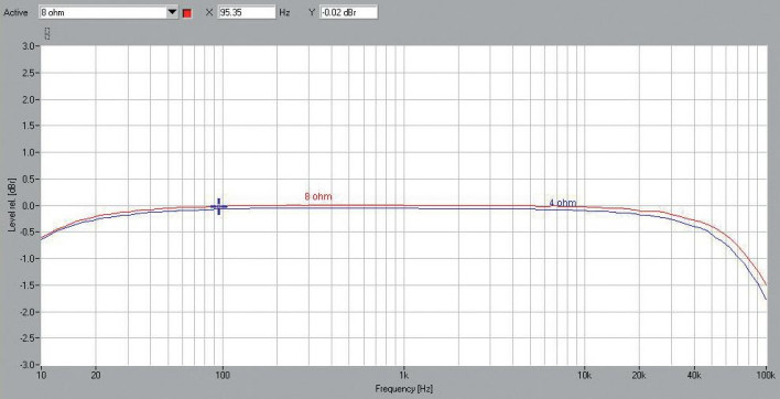 E-380 z łatwością poradził sobie też obciążeniem 4-omowym, dostarczając 2 x 270 W; tutaj premia względem deklarowanych przez producenta 180 W cieszy jeszcze bardziej, bo świadczy o wysokiej wydajności prądowej. Nad poprzednikiem, modelem E-370, testowanym w AUDIO, E-380 również ma przewagę większą niż zapowiadana przez producenta.