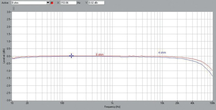 Wobec takiej czułości na uznanie zasługuje odstęp od szumów, S/N wynosi 87 dB. Charakterystyki częstotliwościowe (rys. 1) są doskonałe, przy 10 Hz nie ma żadnego spadku, przy 100 kHz i 8 Ω zaledwie -1 dB, a -1,5 dB przy 4 Ω.
