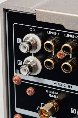 Wejść analogowych na pewno wystarczy – są trzy liniowe (plus dwie pętle dla rejestratorów) i jedno gramofonowe. Wyjść także, bo oprócz tych ze stałym poziomem, jest jedno z regulacją. Wśród wejść liniowych wyróżniono (solidniejszymi gniazdami) parę dla odtwarzacza CD, w specjalnej sekcji ulokowano także wejście gramofonowe.