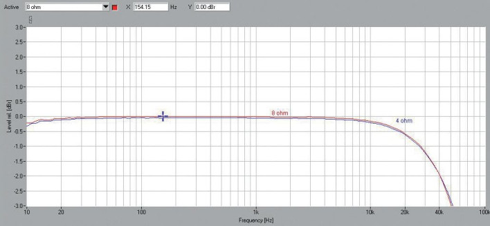 Rys. 1. nie pokazuje żadnych (możliwych, a nawet spodziewanych w konstrukcjach impulsowych) anomalii charakterystyki. Spadek -3 dB wyznaczamy przy 50 kHz (dla obydwu impedancji).
