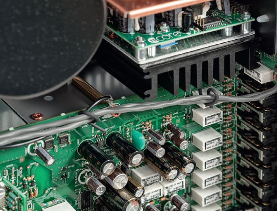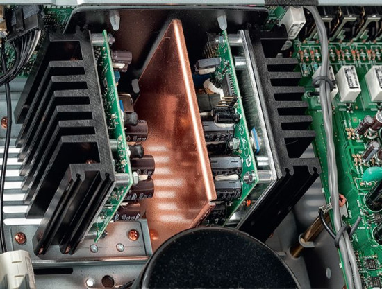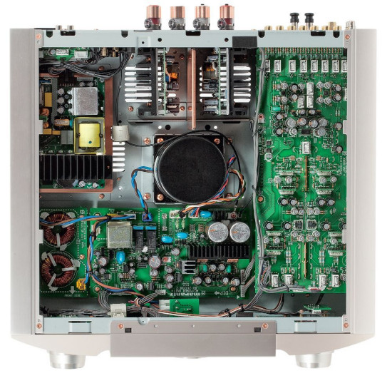 Końcówki mocy to moduły Hypexa z serii Ncore; niewielkie płytki drukowane przykręcono przy tylnej ściance i podłączono bezpośrednio (aby wyeliminować przewody) do zacisków głośnikowych. Marantz zgarnął przy okazji również zaprojektowaną dla nich sekcję zasilającą – impulsową – umieszczoną na kolejnej płytce drukowanej.