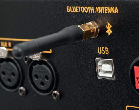 Pierwszym jest USB-B, do którego podłączymy oczywiście komputer. Nieopodal widać drugie złącze, na które należy nakręcić dostarczoną w zestawie antenę - jak można się domyślać Bluetooth, w ten sposób powstaje możliwość strumieniowania z popularnych urządzeń mobilnych.