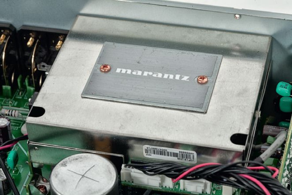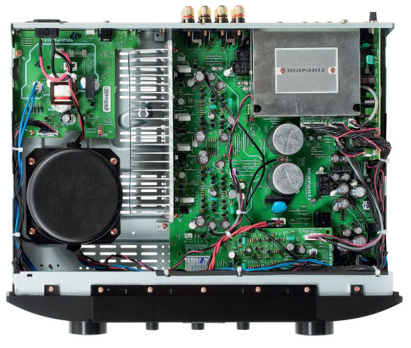 Wnętrze Marantza PM6007 wygląda konwencjonalnie, jednak Marantz zwrócił uwagę na kilka kwestii. W zasilaczu pracuje transformator toroidalny (w ekranie). Końcówki mocy to układ z parą tranzystorów (na kanał), ulokowany na jednym niewielkim radiatorze.