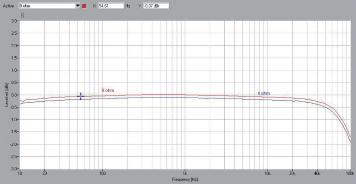 Za to charakterystyki częstotliwościowe (rys.1) są niemal wzorowe. Przy 10 Hz spadek wynosi dziesiąte części decybela, a przy 100 kHz nie przekracza -2 dB.