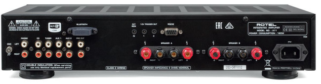 Aktywną parę (spośród dwóch) wyjść głośnikowych wybieramy na przednim panelu, obok wyjścia słuchawkowego. Rotel A11 Tribute ma cztery wejścia liniowe, jedno gramofonowe (MM) i wyjście z przedwzmacniacza. Ponad gniazdami widać plastikową kapsułkę - to moduł Bluetooth, są też złącza wyzwalaczy i RS232.