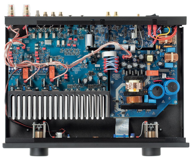W sekcji przedwzmacniacza widać krótką ścieżkę sygnału; tuż przy gniazdach wejściowych zainstalowano przekaźniki, po czym sygnał trafia do nowoczesnego, scalonego regulatora głośności Muses. Mimo wejść XLR, Creek Voyage i20 nie jest wzmacniaczem zbalansowanym; sygnał z XLR-ów jest od razu desymetryzowany.