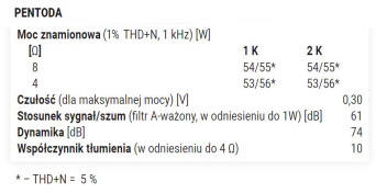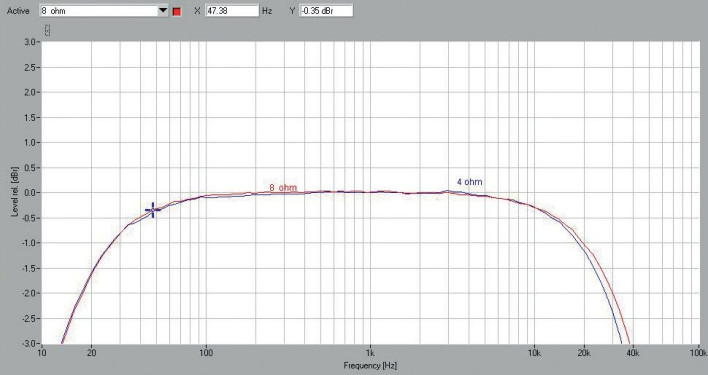 Charakterystyki częstotliwościowe (rys. 1) mają spadki typowe dla wzmacniaczy lampowych, punkty -3 dB wyznaczamy przy 14 Hz i 37 kHz/32 kHz (8 Ω/4 Ω). W konfiguracji triodowej przy 8 Ω i 1% THD+N nie dostajemy obiecywanych 2 x 35 W, tylko 2 x 28 W, ale przesuwając granicę THD+N do 5%, mamy aż 64 W; przy 4 Ω i 1% THD+N wyciągniemy katalogowe 35 W, a przy 5% już niewiele więcej, bo 41 W.