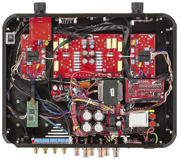 Na instalację modułu cyfrowego we wzmacniaczu lampowym decyduje się niewielu producentów. To sprawa delikatna – DAC nie pasuje "ideowo" do lamp, a jego obecność może wprost zakłócić pracę obwodów lampowych. Chcąc temu zapobiec, umieszczono go na dwóch niewielkich płytkach i odsunięto najdalej jak to możliwe.