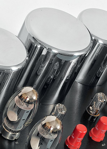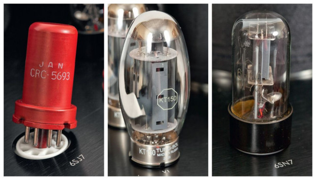 Na górnym blacie widać w sumie osiem lamp. Daniem głównym jest w tej wersji jedna para (na kanał) KT150 produkcji Tung-Sol. Uzupełniają je dwie podwójne triody 6SN7 oraz dwie 6SJ7.