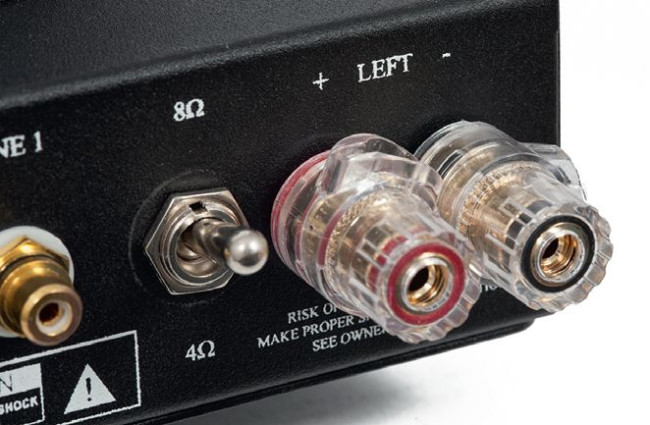 Wyjścia głośnikowe są pojedyncze, bez niezależnych (fizycznych) terminali dla obciążeń 4- i 8-omowych, a właściwe odczepy są wybierane przełącznikiem hebelkowym. To w sumie rozwiązanie najwygodniejsze.
