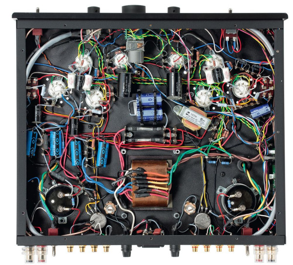 Tryb Ultralinear pozwala zwykle osiągnąć wyższą moc wyjściową (z takiego samego układu lamp), wszystkie zapowiedzi zweryfikujemy w Laboratorium. Przed kwartetem KT88 widać dwie lampy 6922 (w przedwzmacniaczu) oraz dwie 6SN7 (w stopniu sterującym). Wszystkie dostarczyła firma Electro Harmonix.